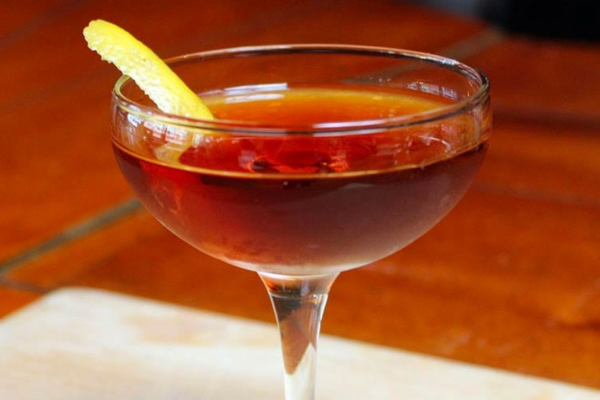 A combination of dark rum, sweet vermouth, lemon juice, canned peach syrup, Grand Marnier, and a few dashes of orange bitters. In order to prepare it, half of a canned peach is first placed in the bottom of a cocktail glass, which is then halfway filled with shaved ice.