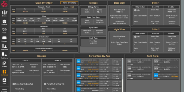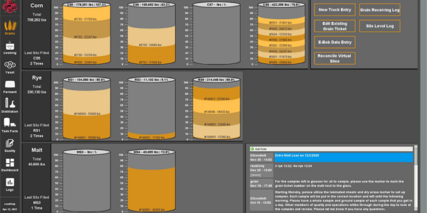 The grains screen displays the grain silos at the distillery with the weight of the grain in pounds. In each silo graphic, the grain amounts are divided and color-coded by the corresponding truck ticket, so operators can easily see how much grain from each truckload is in a silo. The system records parameters like kernel damage, moisture level, foreign material, GMO, and other factors.