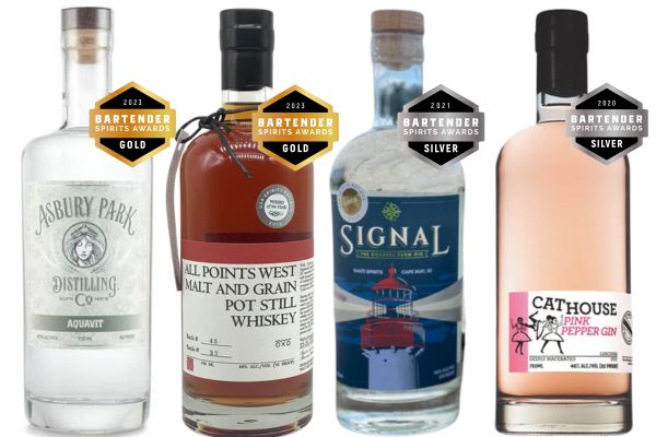 Image: Winning members from the New Jersey Craft Distillers Guild at the Bartender Spirits Awards; (L - R) Asbury Park Distilling Co. Aquavit, All Points West Grain and Malt Pot Still Whiskey, Nauti Spirits Distillery - Signal the Coastal Farm Gin, Cathouse Pink Pepper Gin
