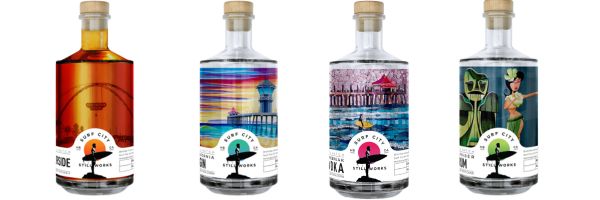 Image: From Left to Right - Pierside Bourbon Whiskey, California Gin, Shorebreak Vodka, and Surfrider Rum.