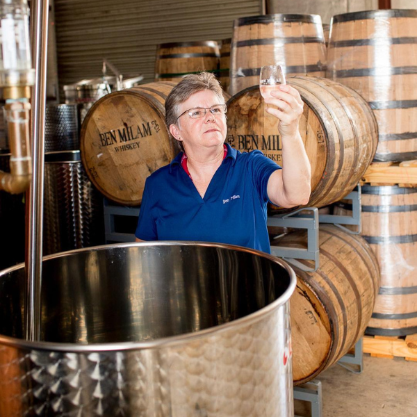 Image: Master distiller Marlene Holmes with over 27 years of bourbon distilling under her belt, checking the distilled whiskey.